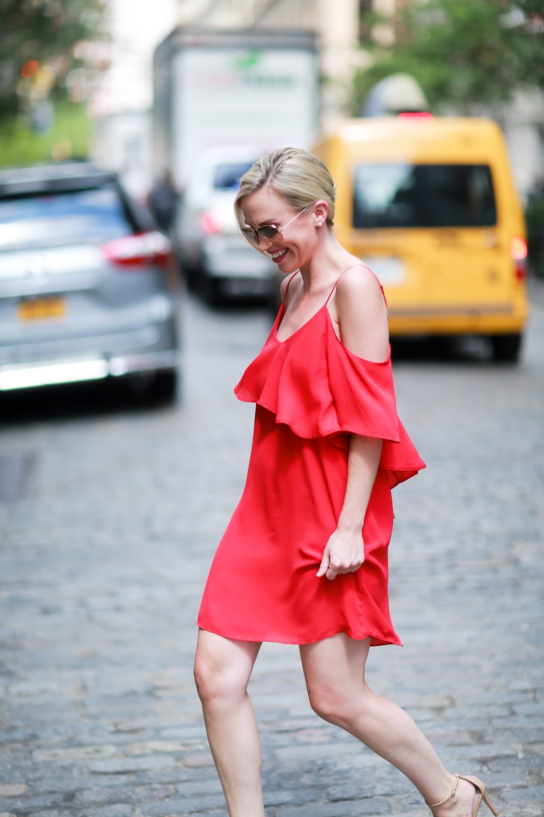 This red dress has been perfect in the NYC heat over the last few weeks; I’ve been wearing it quite a bit! It’s super light, and the cold-shoulder aspect keeps things nice and cool. The low back is also my favorite part..aside from the fact that it’s under $100! I wore the dress to dinner and drinks at Vandal with this clutch and these shoes, and I’ve also dressed it down during the day with simple sandals like these (on sale) and a denim jacket (love this one). I’ve also got my eye on this long-sleeve red dress for the fall (the black is great, too)!